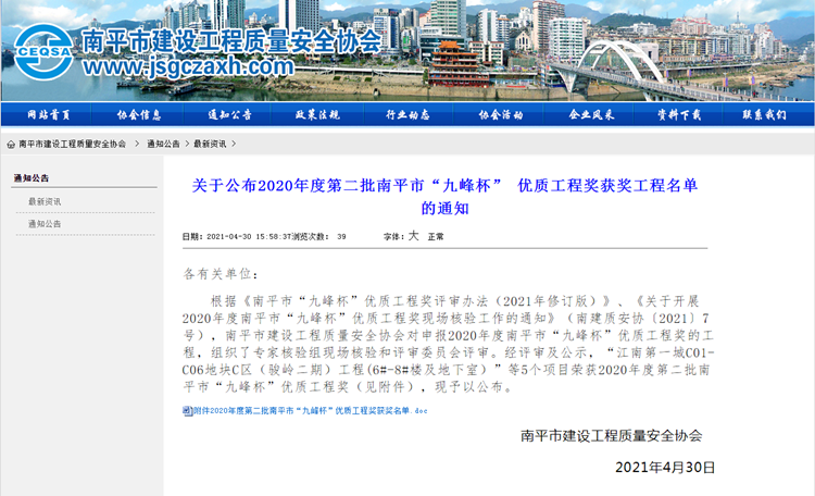 4月30日,南平市建設(shè)工程質(zhì)量安全協(xié)會公布了2020年度第二批南平市“九峰杯”優(yōu)質(zhì)工程獎,由安徽三建公司承建的南平駿嶺二期項目、駿嶺三期項目榜上有名,喜獲“九峰杯”優(yōu)質(zhì)工程獎,該獎項是南平市建設(shè)工程最高獎項。