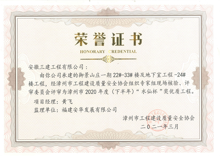 5月17日,公司收到漳州市工程建設質量安全協(xié)會寄來的獎杯和獎狀,由安徽三建廈門公司負責實施的御景山莊一期22#樓-33#樓及地下室工程榮獲“水仙杯”優(yōu)質工程獎,該獎項是漳州市工程建設質量最高獎項。