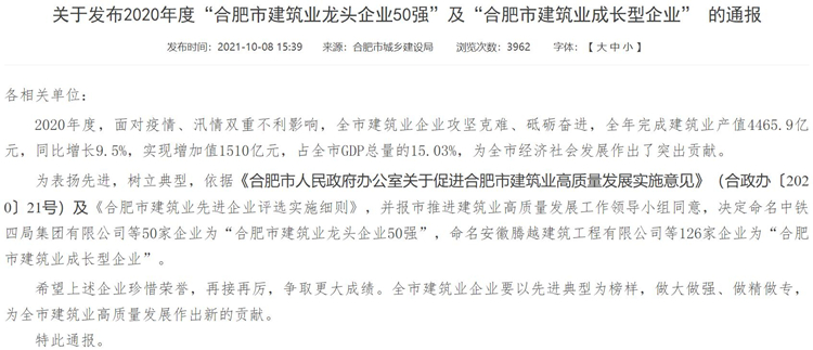 近日,從合肥市城鄉(xiāng)建設局傳來喜訊,公司喜獲2020年度“合肥市建筑業(yè)龍頭企業(yè)50強”榮譽稱號,位列前三甲。
