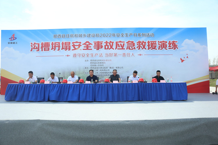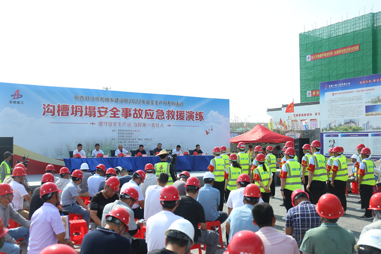 為深入推進(jìn)全國“安全生產(chǎn)月”活動,切實(shí)提升企業(yè)安全管理與應(yīng)急管理能力,6月26日下午3時(shí),肥西縣在我公司產(chǎn)融項(xiàng)目舉行“建設(shè)工程溝槽坍塌安全事故應(yīng)急救援演練”活動。參加此次活動有肥西縣副縣長衛(wèi)涌波,肥西縣住房和城鄉(xiāng)建設(shè)局局長劉家興,副局長柳振,黨委委員、總工程師湯道勝,花崗鎮(zhèn)副書記、副鎮(zhèn)長程子光,肥西縣城鄉(xiāng)建設(shè)投資(集團(tuán))有限公司總經(jīng)理?xiàng)钪久鳎?/span>公司黨委委員、副總經(jīng)理張斌及觀摩活動的各施工建設(shè)單位人員共計(jì)120余人。