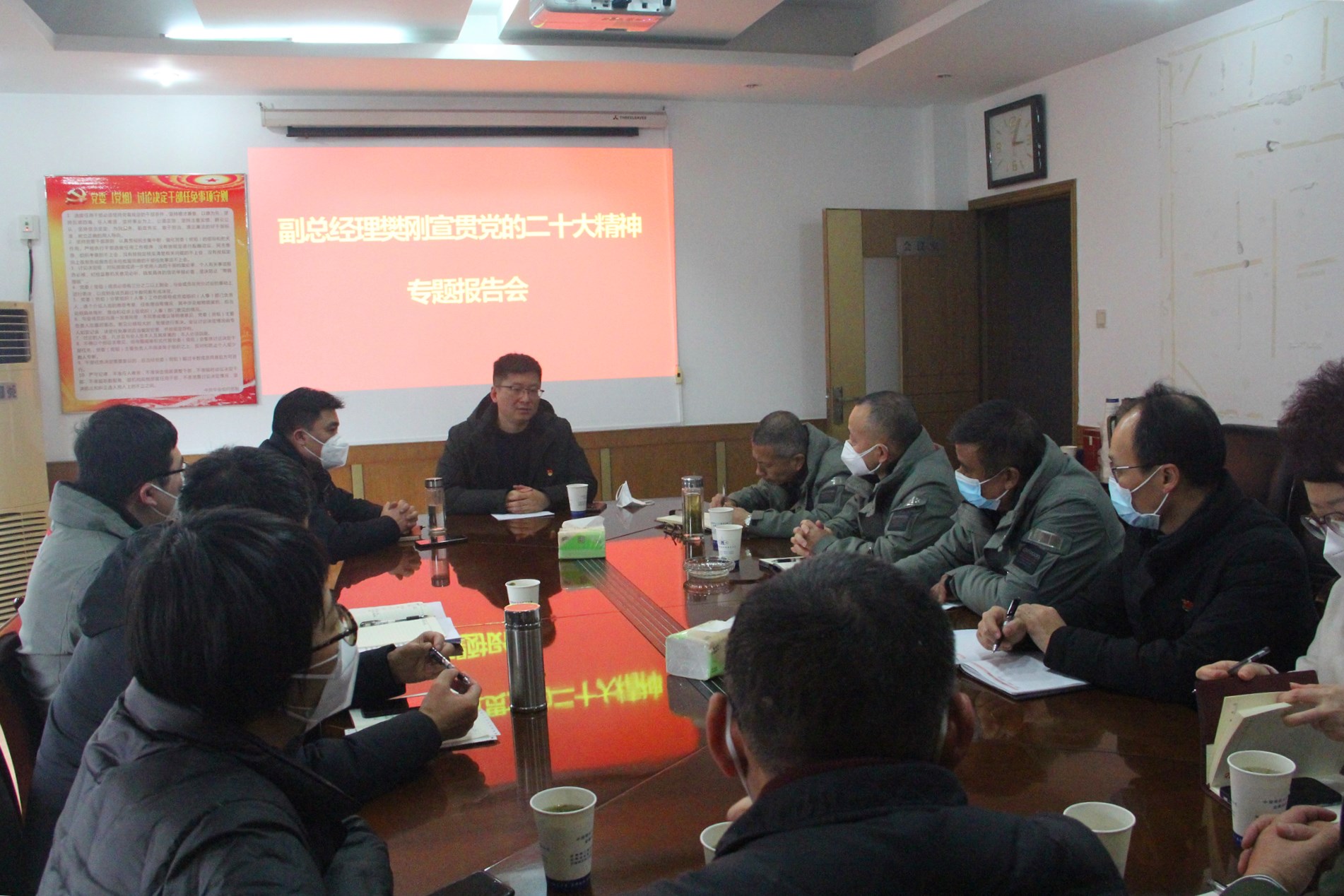 宣講會(huì)上,樊剛緊緊圍繞黨的二十大精神實(shí)質(zhì),重點(diǎn)從深刻領(lǐng)會(huì)黨的二十大的重大意義、黨的二十大的主題、新時(shí)代十年的偉大變革、馬克思主義中國(guó)化時(shí)代化新境界、中國(guó)式現(xiàn)代化的中國(guó)特色、堅(jiān)持團(tuán)結(jié)奮斗等方面進(jìn)行了系統(tǒng)深入宣講。樊剛強(qiáng)調(diào),各參會(huì)單位要把學(xué)習(xí)宣傳貫徹黨的二十大精神作為當(dāng)前和今后一個(gè)時(shí)期的首要政治任務(wù),與抓好當(dāng)前主要工作和謀劃今后重點(diǎn)工作結(jié)合起來(lái),緊密圍繞公司補(bǔ)短板、控風(fēng)險(xiǎn)、拓市場(chǎng)、鑄品牌的發(fā)展方針,找準(zhǔn)發(fā)展方向,堅(jiān)持問題導(dǎo)向,勇于攻堅(jiān)克難,以實(shí)干實(shí)績(jī)?yōu)槠髽I(yè)高質(zhì)量發(fā)展做出更大貢獻(xiàn)。
