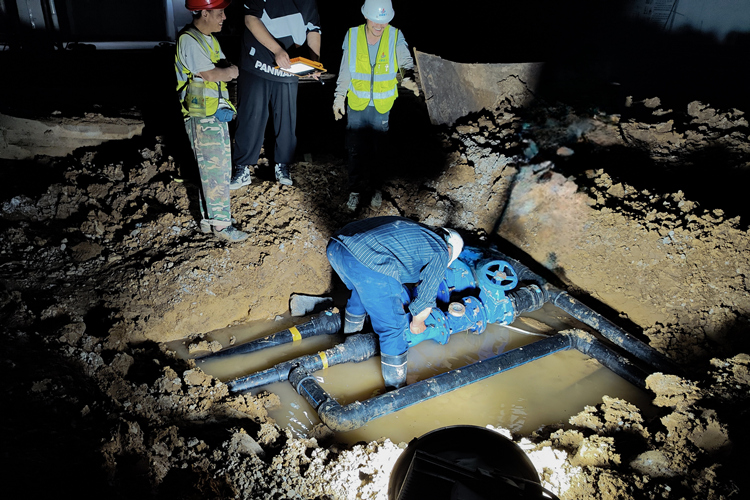 一天晚上,正值項目室外給水及消防新老管網(wǎng)接駁,為了確保工程萬無一失,建工三建優(yōu)秀共產(chǎn)黨員、安裝項目經(jīng)理曾小均同志充分發(fā)揮黨員先鋒模范帶頭作用,與施工員高峰同志一起下到泥濘不堪的水坑中安裝閥門。由于夜間作業(yè)面的能見度受到限制,于是,技術(shù)員孫維康同志便舉著燈,同技術(shù)負(fù)責(zé)楊濤同志一起摸排接駁的管道是否存在漏水點。雖然工作很辛苦,但是看到大家都在為了達(dá)成同一個目標(biāo)而共同拼搏的場景,每一個安裝管理人員又都充滿干勁,就像曾小均說的那樣:“這是安裝人應(yīng)有的使命與擔(dān)當(dāng)!是建工三建一脈相承的鐵軍精神和不辱使命鐵肩擔(dān)當(dāng)?!?/span>