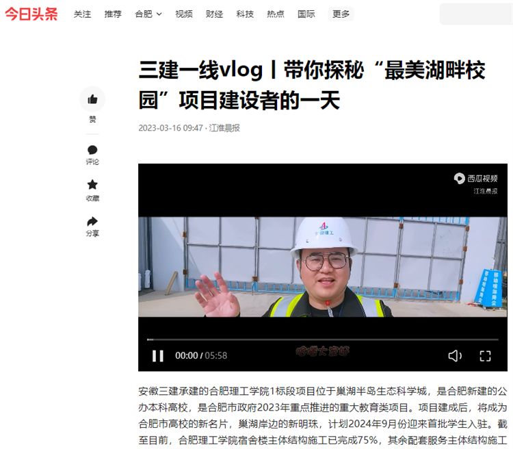 近日,學(xué)習(xí)強國、今日頭條、合肥晚報等主流媒體聚焦公司一線vlog,該視頻以較為新穎的vlog形式,聚焦項目一線管理人員工作生活動態(tài),展現(xiàn)項目建設(shè)成果,受到廣泛關(guān)注。