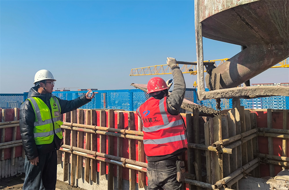 “即使寒風(fēng)刺骨,即使春節(jié)已至,但我愛崗的心熾熱無比,敬業(yè)的意志堅不可摧!”技術(shù)員劉振宇在旁站2號樓架構(gòu)層混凝土澆筑工作。