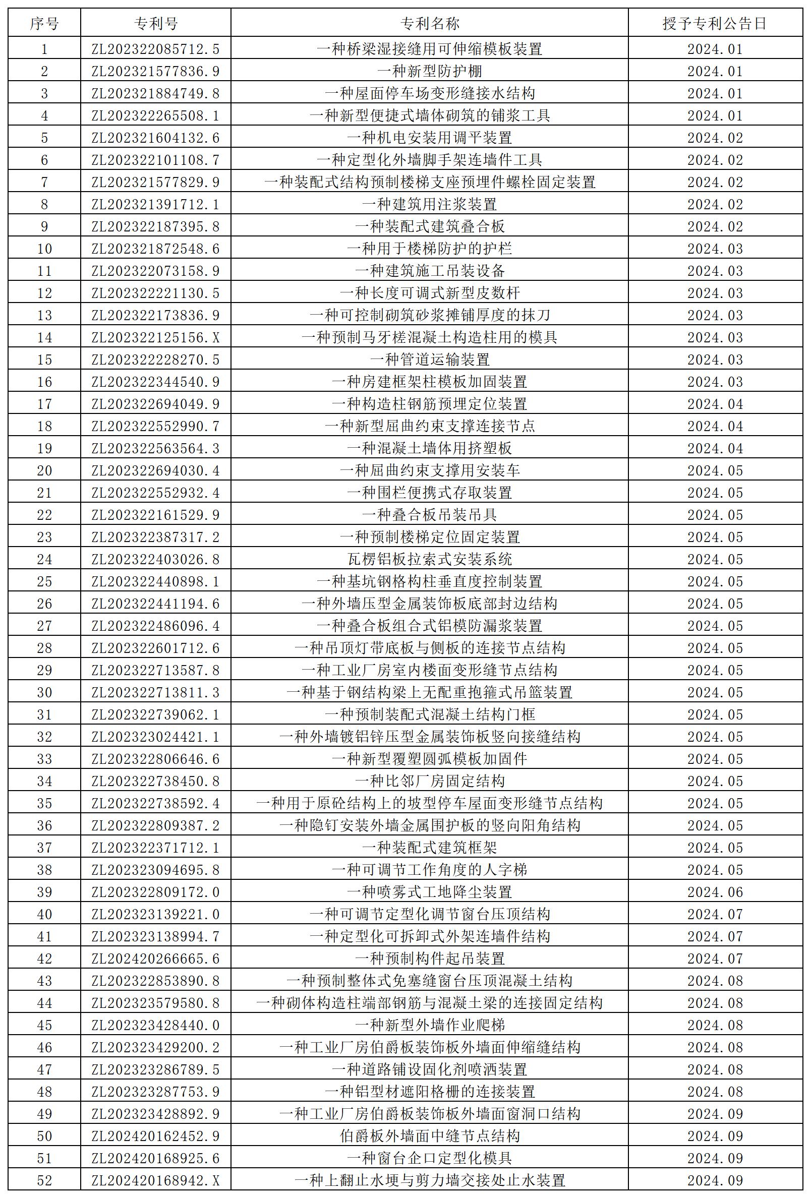 2024年公司授權(quán)實用新型專利52項 發(fā)布時間:2024-10-14 來源:工程建設研究院 撰稿人:徐冬 瀏覽次數(shù):2965 2024年公司授權(quán)實用新型專利52項。