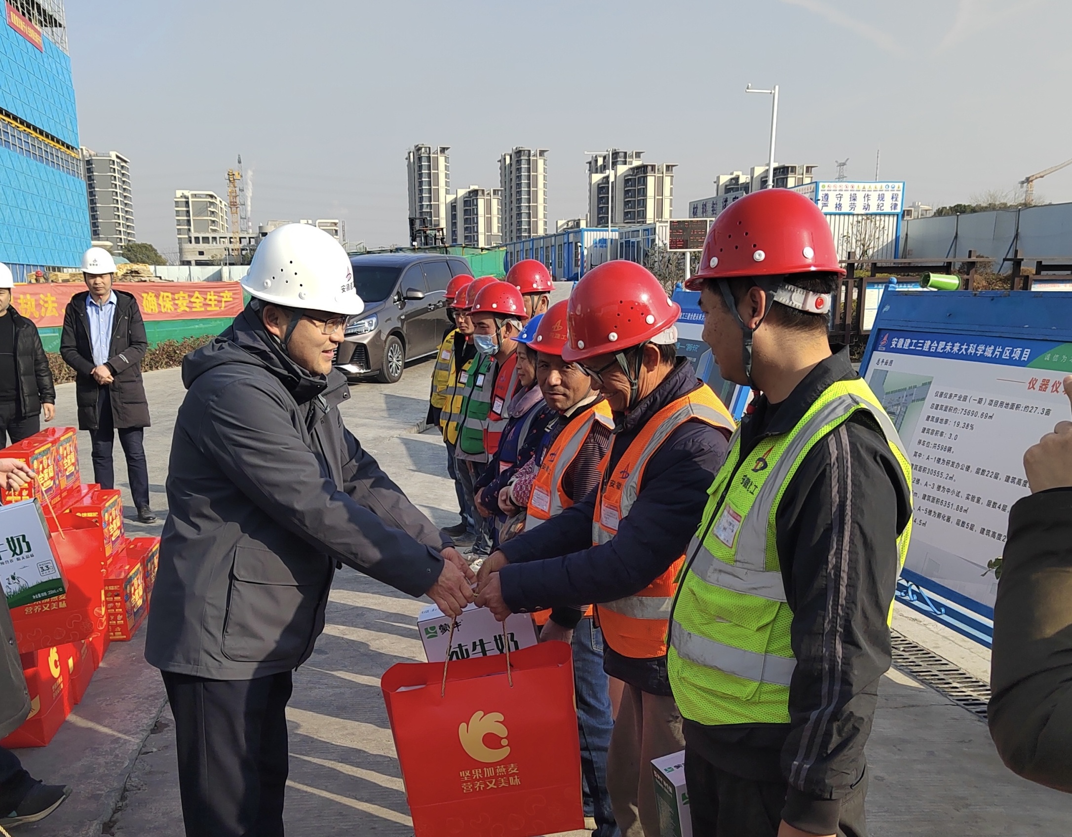 1月18日,合肥市城鄉(xiāng)建設(shè)局黨組成員、副局長(zhǎng)沈國(guó)保,廬陽(yáng)區(qū)住建局局長(zhǎng)劉斌一行人深入公司合肥未來大科學(xué)城片區(qū)一期儀器儀表產(chǎn)業(yè)園(一期)項(xiàng)目調(diào)研慰問,為堅(jiān)守在崗位上的一線工友們送上了暖心禮包,致以新春的美好祝福 。