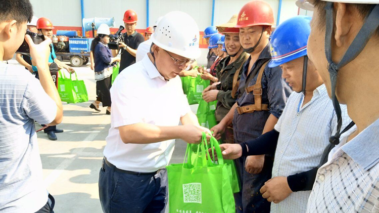 劉斌一行深入施工現(xiàn)場,親手為項目管理人員和施工人員們送上清涼油、毛巾、水杯、綠茶等防暑降溫物品,對烈日下仍堅守在一線崗位的建設(shè)者們進行了親切慰問。劉斌詳細詢問了現(xiàn)場人員的工作生活情況,囑咐大家注意避峰作業(yè),工作中做好防暑降溫措施。他還要求項目部人員提高安全生產(chǎn)意識,加強對防暑降溫常識和中暑急救知識的宣傳教育工作,確保職工的身體健康,為安全生產(chǎn)的順利進行提供保障。