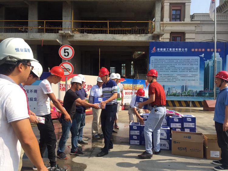 姚永一行深入恒大御府項目一線,詳細了解項目基本概況與工人工作環(huán)境,詢問了項目上防暑降溫措施落實情況,隨后為在高溫下作業(yè)的工人們送去了礦泉水、毛巾、藿香正氣滴丸等防暑降溫物品,把清涼送到了一線工地,把關懷送到了工人的心里。姚永主任叮囑項目部,要采取“干兩頭、歇中間”的方式,合理安排作業(yè)時間,防止高溫中暑安全事故的發(fā)生。他要求項目部要增強高溫作業(yè)的安全意識,做好防暑降溫的常識宣傳,在確保施工質(zhì)量和安全的前提下確保項目工期履約,做到安全生產(chǎn)與防暑降溫兩不誤,確保平安度夏。