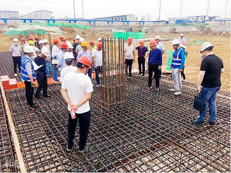 圖為觀摩團(tuán)一行觀摩現(xiàn)場鋼筋綁扎工序