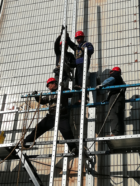 2月18日大年初七,輕鋼龍骨公司廠區(qū)內(nèi)一派繁忙,金加工車(chē)間主任陳金濤帶領(lǐng)著師傅們正在緊張忙碌著安裝升級(jí)版整體附著式升降腳手架(智能爬架)樣機(jī),經(jīng)過(guò)三天的加班加點(diǎn),順利完成了3個(gè)機(jī)位的拼裝和爬升,靚麗的新爬架矗立在輕鋼龍骨公司大樓上,展示出蓬勃昂揚(yáng)的新氣象。