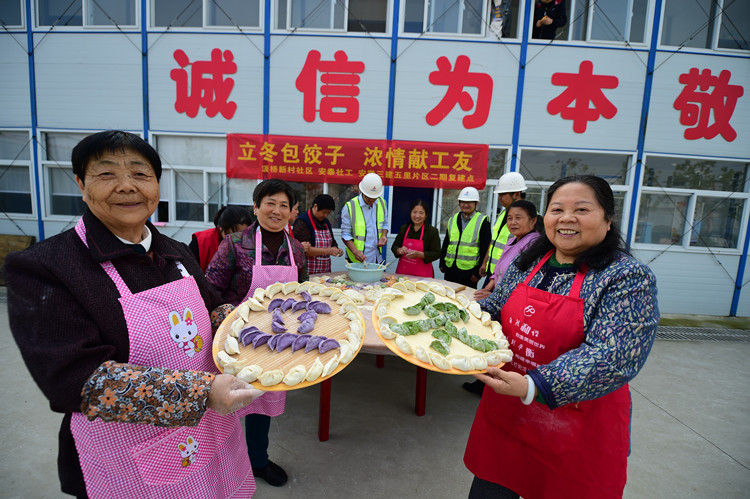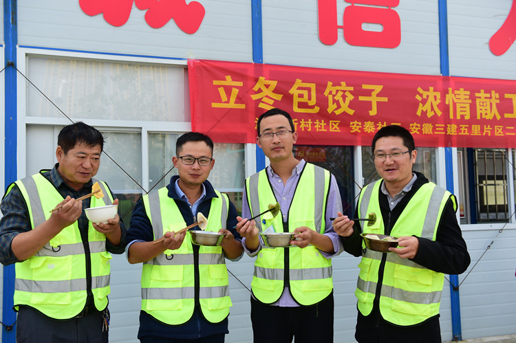 安徽三建五里片區(qū)項目臨時黨支部與汲橋社區(qū)志愿者聯(lián)合開“立冬包餃子 濃情獻工友”活動