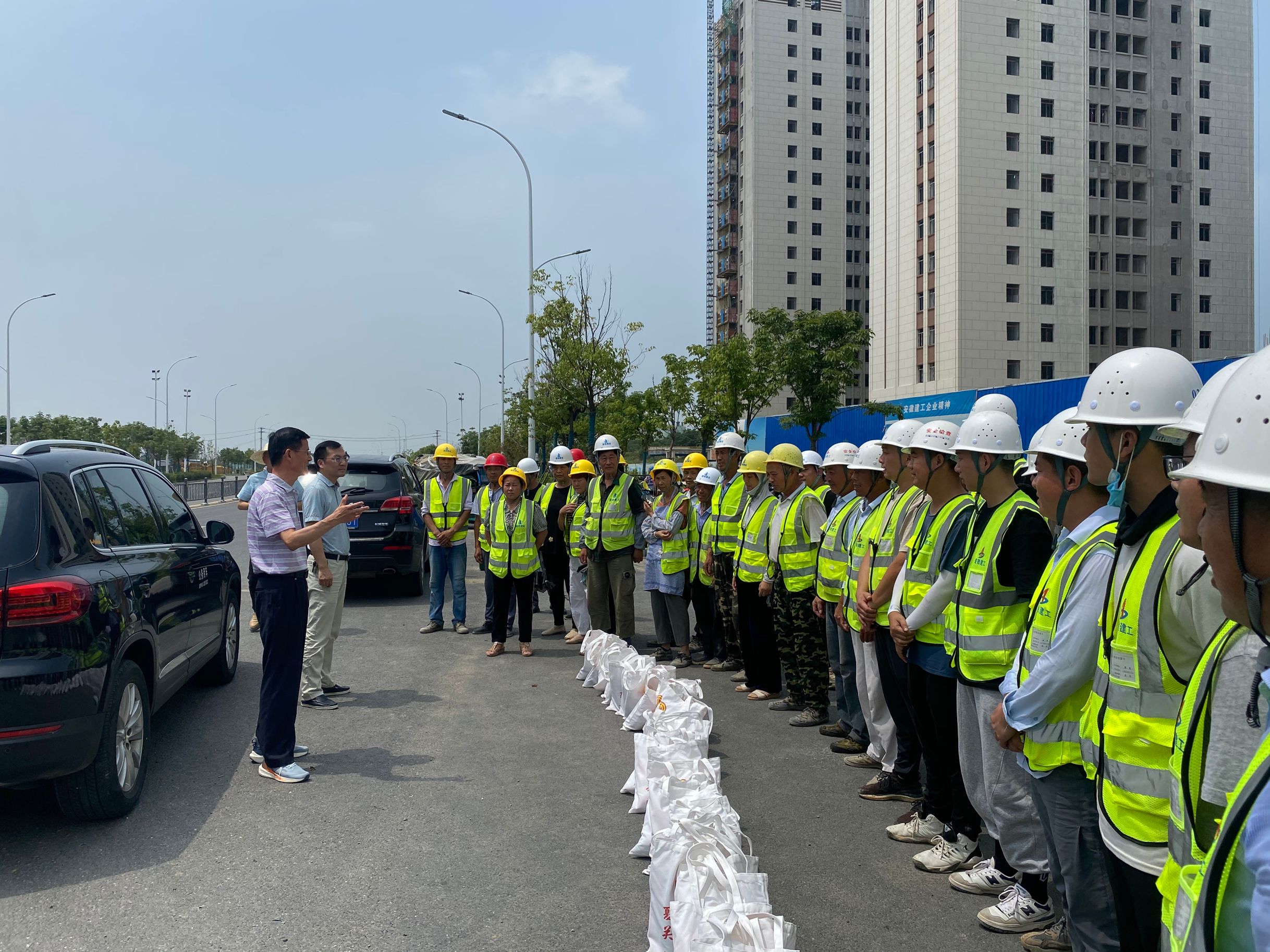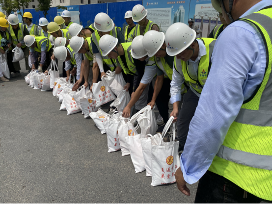 近日天氣持續(xù)高溫,7月19日上午,合巢產(chǎn)業(yè)新城指揮部辦公室副主任、黨支部書記張維鑄,建發(fā)局副局長肖勇一行人代表安徽巢湖經(jīng)濟(jì)開發(fā)區(qū)總工會(huì)帶著毛巾、花露水等消暑降溫慰問品來到合巢產(chǎn)業(yè)新城郭塘新村、映湖公租房項(xiàng)目施工一、二標(biāo)段,看望、慰問奮戰(zhàn)在一線的建設(shè)者。一行人向施工單位表示感謝;其次,要求在抓工程進(jìn)度時(shí),一定要高度重視施工安全,叮囑建筑工人在施工中注意防暑避暑。