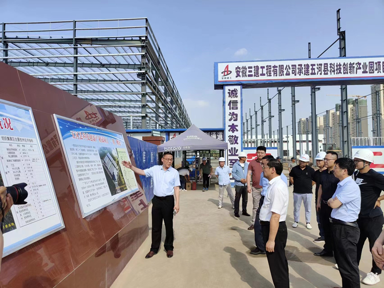 金勝慶一行先后深入五河縣科技創(chuàng)新產(chǎn)業(yè)園項目、五河縣紡織集聚區(qū)項目施工現(xiàn)場,聽取項目在建設進度、安全生產(chǎn)、疫情防控等方面工作匯報,詢問了解項目推進中遇到的問題,協(xié)調(diào)相關(guān)部門現(xiàn)場研究解決辦法,充分肯定了五河縣科技創(chuàng)新產(chǎn)業(yè)園項目、紡織集聚區(qū)項目進場以來取得的成績,高度肯定安徽三建國企擔當、國企品質(zhì)。金勝慶表示,安徽三建要繼續(xù)高標準、嚴要求,打造精品工程,在確保安全和質(zhì)量的基礎(chǔ)上,嚴格按照時間任務節(jié)點,科學謀劃、統(tǒng)籌安排,做好工程調(diào)度,強化監(jiān)管,確保項目早建成、早使用;相關(guān)部門要加強統(tǒng)籌協(xié)調(diào),強化服務保障,形成工作合力,結(jié)合企業(yè)項目建設情況,幫助企業(yè)解決項目建設中存在的困難和問題,確保每一個環(huán)節(jié)環(huán)環(huán)相扣,項目能夠落實到實處,能夠早建成,高效投產(chǎn)運營。