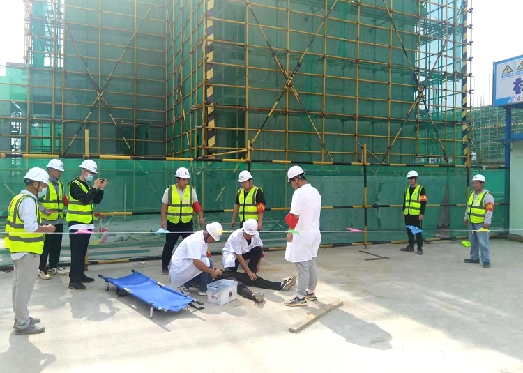 應(yīng)急小組分為通訊聯(lián)絡(luò)組、事故救援組、醫(yī)療救護(hù)組、后勤保障組四個(gè)小組。這次演練主要模擬在塔吊吊取材料過程中發(fā)生意外事故,一名工人不慎被料斗里的物體砸傷,演練過程中,安全員發(fā)現(xiàn)傷者第一時(shí)間匯報(bào)項(xiàng)目經(jīng)理,項(xiàng)目經(jīng)理隨即啟動(dòng)應(yīng)急救援預(yù)案,各應(yīng)急小組在處理事故、情況上報(bào)、通訊聯(lián)絡(luò)、醫(yī)療救護(hù)、現(xiàn)場警戒疏散等環(huán)節(jié)中有序配合,各司其職。最后醫(yī)療救護(hù)組將傷員放置擔(dān)架送往醫(yī)院救治,此次演練圓滿結(jié)束。