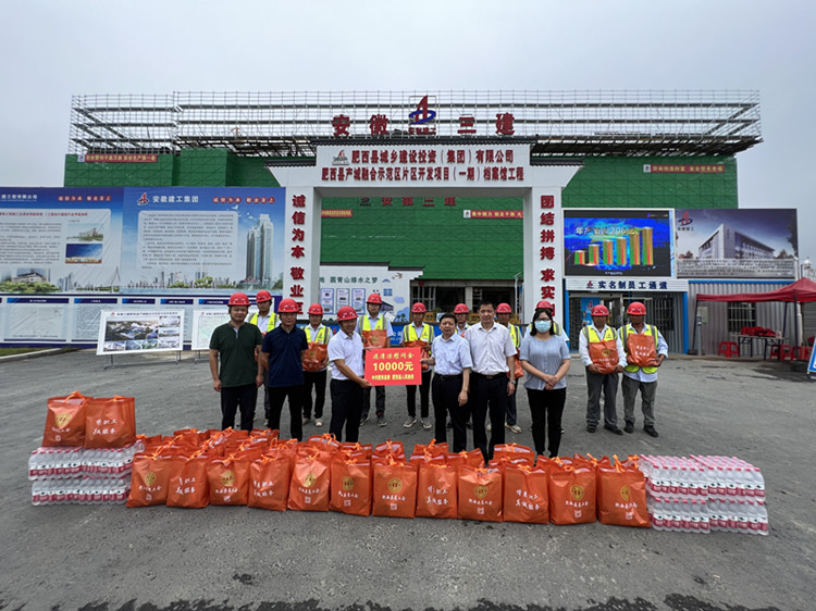 隨后,成忠為項(xiàng)目建設(shè)者發(fā)放綠豆、礦泉水、毛巾、清涼油等防暑物資,并代表肥西縣委縣政府向項(xiàng)目送來“送清涼”慰問金壹萬元,詳細(xì)了解職工的日常工作情況和高溫勞動防護(hù)措施情況,對他們不畏酷暑,不辭辛苦的堅(jiān)守表示致敬。他叮囑,項(xiàng)目建設(shè)者要做好防暑降溫措施,保障自身的安全健康,項(xiàng)目要合理安排作業(yè)時(shí)間,加強(qiáng)防暑降溫、勞動保護(hù)知識的宣傳,為高溫天氣戶外作業(yè)職工避暑休息提供便利,創(chuàng)造安全、健康、和諧的工作環(huán)境。