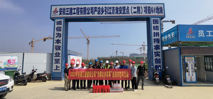 7月22日,建機公司領(lǐng)導班子一行赴嚴店鄉(xiāng)引江濟淮安置點和舒城項目部開展“送清涼”慰問活動,為項目一線人員發(fā)放毛巾、香皂、清涼油、風油精、礦泉水等防暑降溫用品,為烈日下的施工人員送去清涼關(guān)懷。