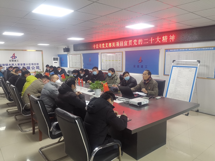 根據(jù)公司黨委統(tǒng)一部署,1月2日上午,十公司黨支部書記吳明寬前往水岸人家項(xiàng)目開展“讓黨的二十大精神在施工一線落地生根”主題宣講活動(dòng)。十公司水岸人家項(xiàng)目、長(zhǎng)豐縣北城醫(yī)院一標(biāo)段項(xiàng)目、雙墩中心小學(xué)項(xiàng)目全體管理人員及項(xiàng)目部分工友參加此次宣講活動(dòng)。