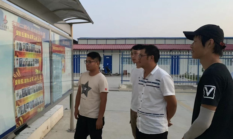 項(xiàng)目職工在“每月之星”宣傳欄前了解學(xué)習(xí)