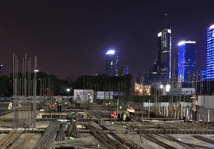 合肥市中心圖書館項目是合肥市重點工程,為保證施工進度,項目部不僅備好涼白開、礦泉水、綠豆湯、還有仁丹等解暑物品,錯開上午10點至下午3點白天高溫時間段進行施工,還將農(nóng)民工學(xué)校教室及會議室空調(diào)全天開啟,以備工人休息使用。圖中是在華燈初上的天鵝湖畔,廣大工人師傅正在進行地庫鋼筋綁扎及外架搭設(shè)工作。