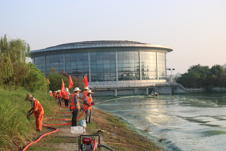 當(dāng)天,一大早,70多名黨員、職工就趕到巢湖環(huán)湖北路塘西河大橋邊,現(xiàn)場(chǎng)成立了三支黨員突擊隊(duì),大家頭頂烈日,冒著37攝氏度的高溫,投入到治理藍(lán)藻攻堅(jiān)戰(zhàn)中。大家沿湖開(kāi)展集中作業(yè),連續(xù)抽取湖水投放殺藻劑或絮凝劑,再排放回湖中。在藍(lán)藻治理活動(dòng)中,廣大黨員、團(tuán)員勇當(dāng)先鋒,連續(xù)工作12小時(shí), 大家的工作服干了又濕,濕了又干。十二公司青年黨員曾祥軍同志說(shuō):“八百里巢湖是合肥的名片,是合肥市寶貴的自然資源,能夠參與到巢湖藍(lán)藻治理中,做保衛(wèi)環(huán)境的戰(zhàn)士,義不容辭”。